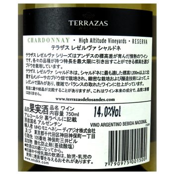 標高1200mのアンデスの高地で育まれたシャルドネ。よく熟れた桃やパインアップルの香り心地よい酸味とミネラル感のあるワイン。