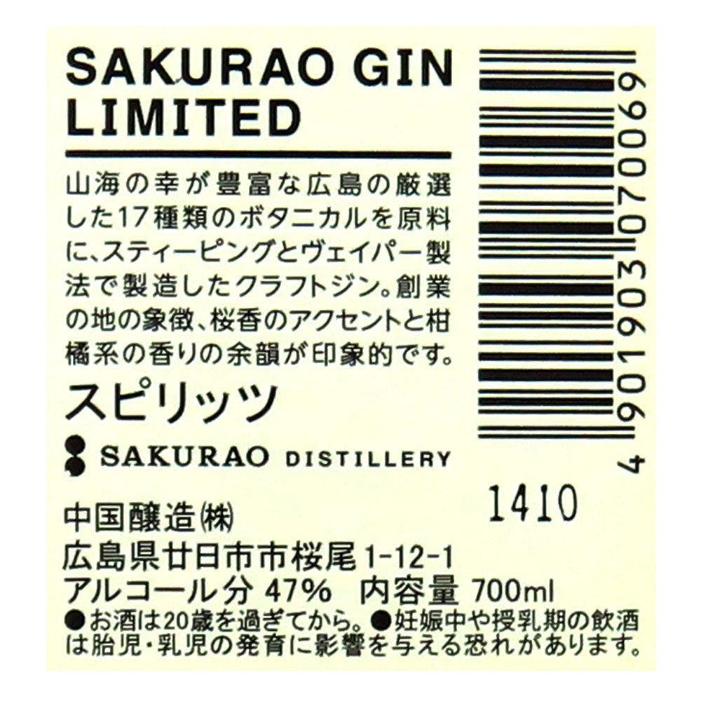 「桜香」のアクセントと柑橘系の香りの余韻が印象的。ジュニパーベリー等広島県産ボタニカルのみで製造した、国産ジンです。