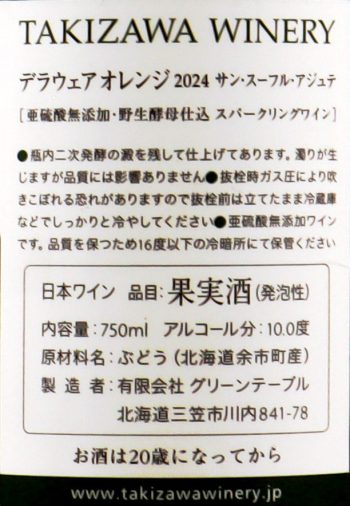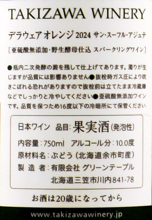 タキザワワイナリーの新しい挑戦となる、デラウェアオレンジのスパークリングワインです!生産本数は1,335本。豊かな果実味があり、洋ナシやべっこう飴のようなふくよかな香りが印象的です。タンニンを優しくするため、通常のデラウェアオレンジよりも抽出時間を少なく仕上げています。スパークリングの爽快感がありながら、一本筋のある優しいタンニンがバランスを保ちながら余韻が続きます。