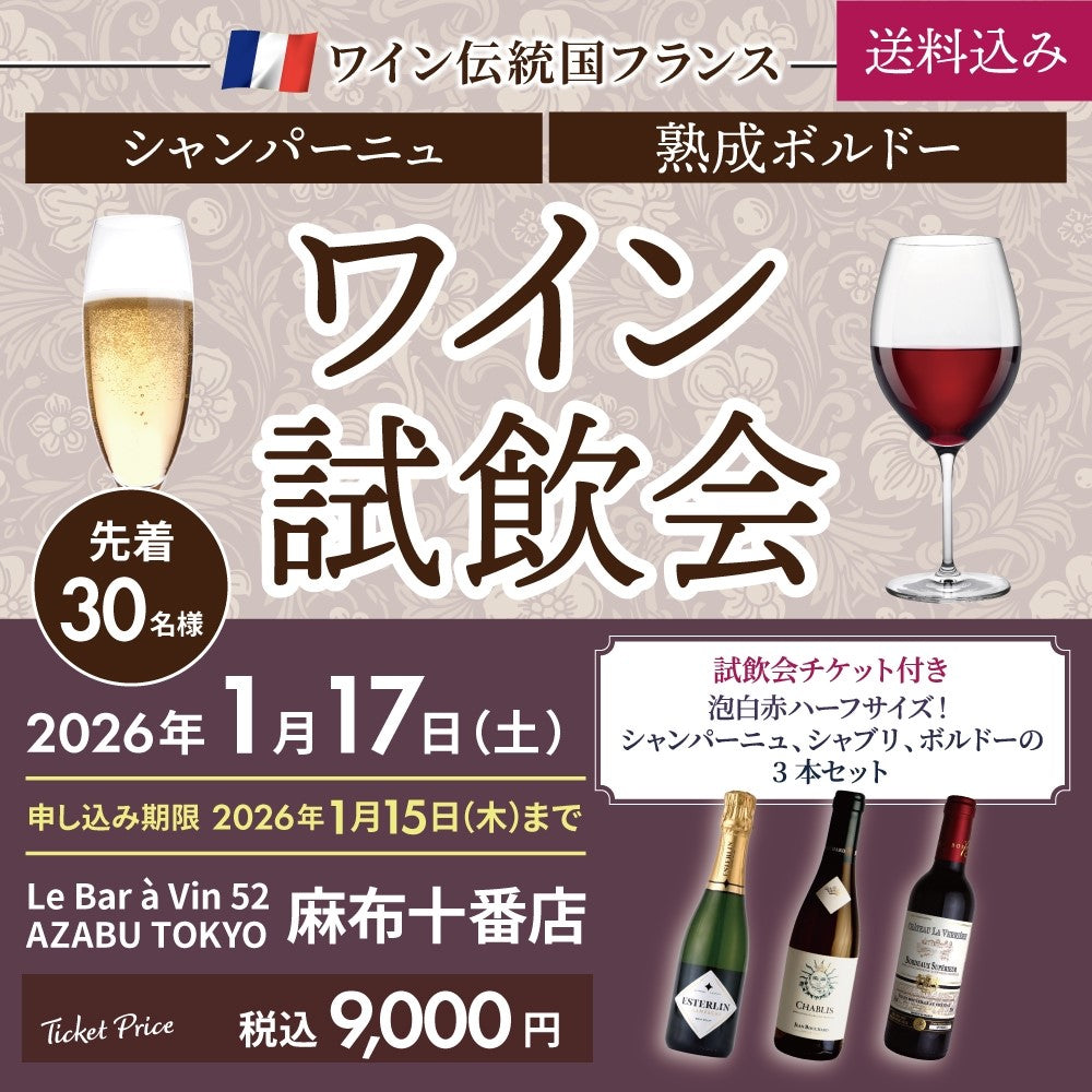 | 開催概要 | □2026年1月17日(土) 12:00~15:00 Le Bar a Vin 52 AZABU TOKYO 麻布十番店にて開催するイベントのチケットです。 □試飲会チケットは、ご注文後1月16日(金)までにご招待メールをお送りいたします。イベント当日に受付にお見せください。 |