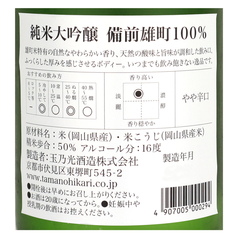天然の酸味のきいたすっきりとした飲み心地です。「雄町」のみで醸した大吟醸酒です。