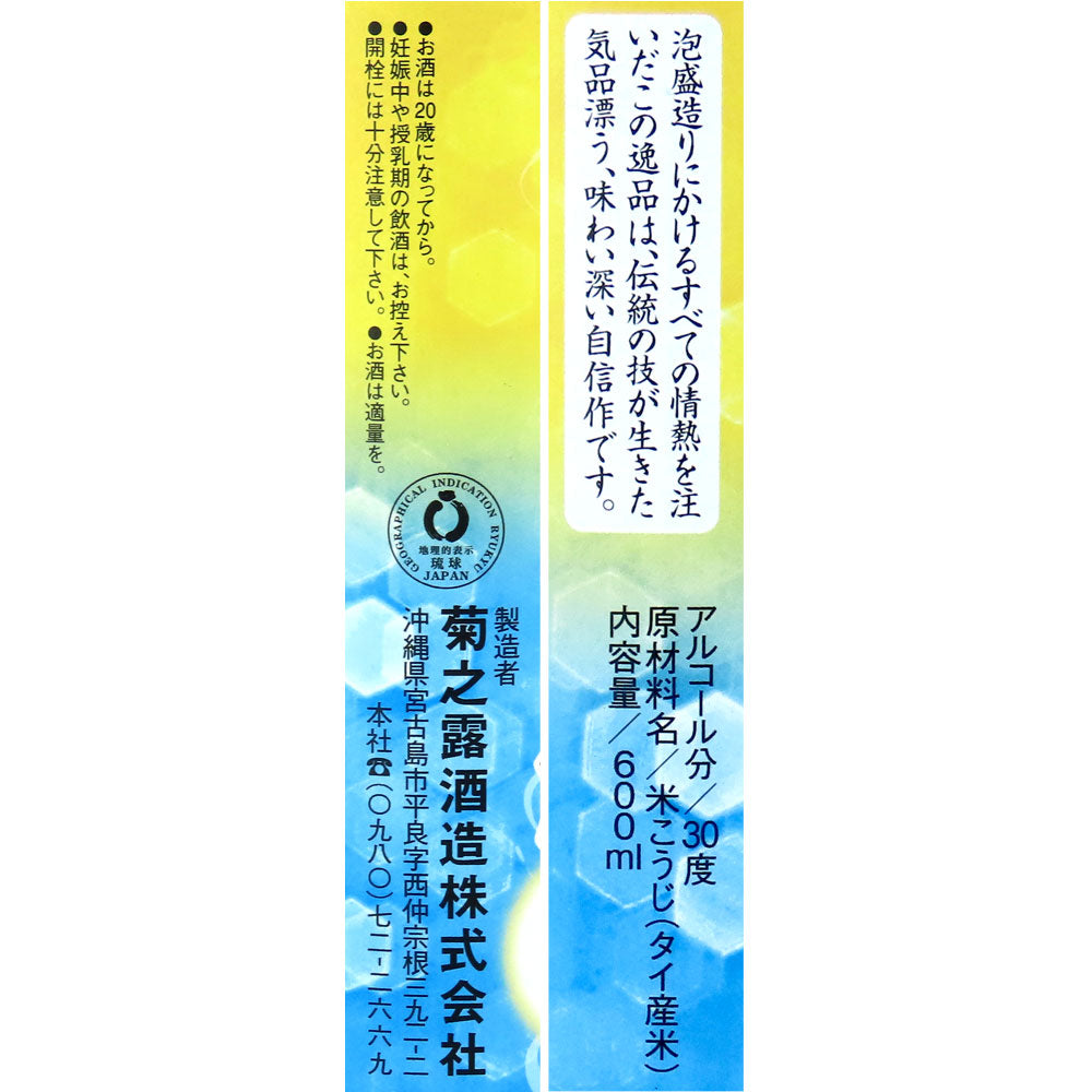菊之露の芳醇で香味のある味わいを3年以上貯蔵熟成させた原酒を厳選し、独自の技でブレンドしました。泡盛の個性をしっかりと感じられる味わい。